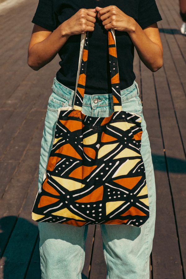 כל תיק נעשה בתפירה אישית על ידי התופרות האהובות שלי בגאנה, וכולל פאטרן אפריקאי מדהים בשילוב עם בד כותנה שמנת או שחור.